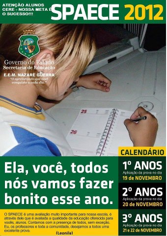 Desde ontem 19 de novembro foi iniciado o SPAECE 2012. Registro da aplicação das avaliações para alunos do 1º Ano do Ensino Médio da EEM. Gabriel Bezerra de Morais (Farias Brito), ocorridas na tarde de ontem. Hoje pela manhã nas turmas do 2º Ano os alunos relatam que as provas estavam fáceis e boas de resolver. Os textos são muito longos para as leituras, critica Marcelo Ferreira Teixeira, aluno do 2º Ano A, manhã. O aluno Wesley, por apresentar baixa visão recebeu prova ampliada e precisou de acompanhamento para a transcrição do seu gabarito que é de tamanho original. A Professora Lucelia Mariano, compareceu para prestar serviços como supervisora INSTITUCIONAL representando a SEDUC/19ª CREDE.