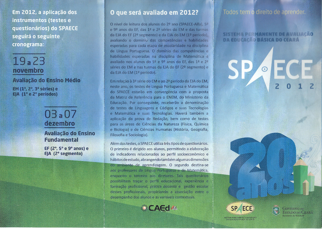Desde ontem 19 de novembro foi iniciado o SPAECE 2012. Registro da aplicação das avaliações para alunos do 1º Ano do Ensino Médio da EEM. Gabriel Bezerra de Morais (Farias Brito), ocorridas na tarde de ontem. Hoje pela manhã nas turmas do 2º Ano os alunos relatam que as provas estavam fáceis e boas de resolver. Os textos são muito longos para as leituras, critica Marcelo Ferreira Teixeira, aluno do 2º Ano A, manhã. O aluno Wesley, por apresentar baixa visão recebeu prova ampliada e precisou de acompanhamento para a transcrição do seu gabarito que é de tamanho original. A Professora Lucelia Mariano, compareceu para prestar serviços como supervisora INSTITUCIONAL representando a SEDUC/19ª CREDE.